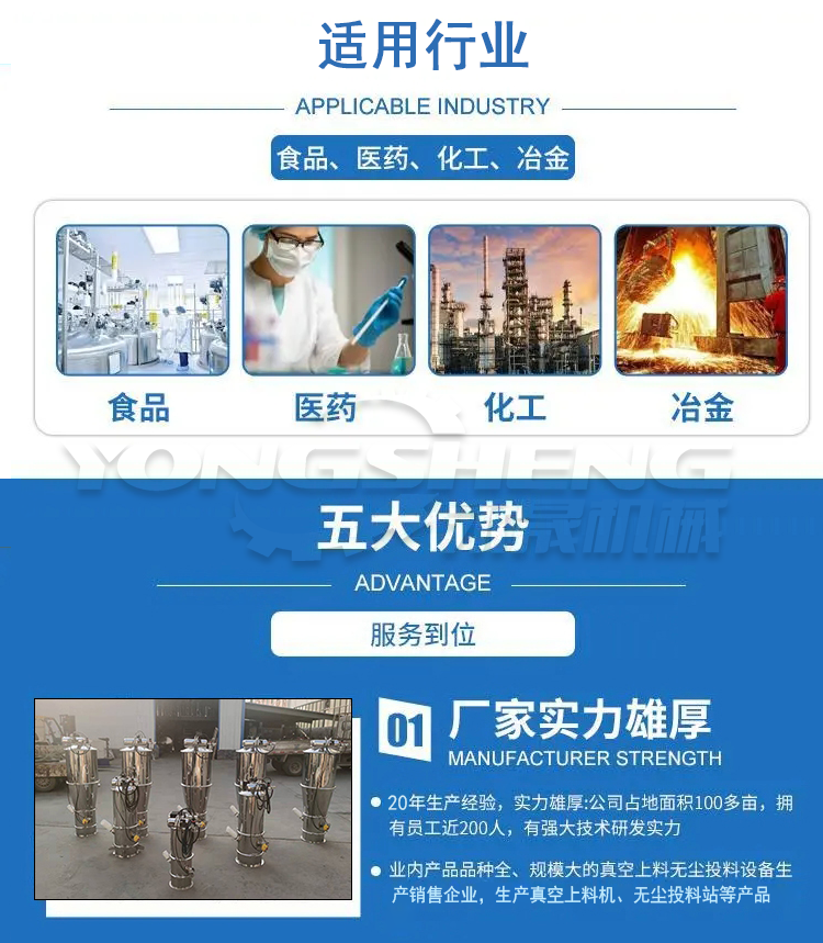 適用行業:真空加料機解決了加料時粉塵外溢等問題,是化工廠、冶金廠、制藥廠、食品廠等行業通過GMP認證,促進文明清潔生產的設備。